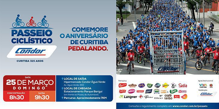Mais de 3.500 ciclistas comemoraram os 325 anos de Curitiba no Passeio Ciclístico Condor, neste domingo, dia 25 de março. Em um trajeto de aproximadamente 7km, participantes de todas as idades pedalaram ao som de um trio elétrico, que animou o passeio durante todo o percurso. Os ciclistas se concentraram no Condor Água Verde e […]
