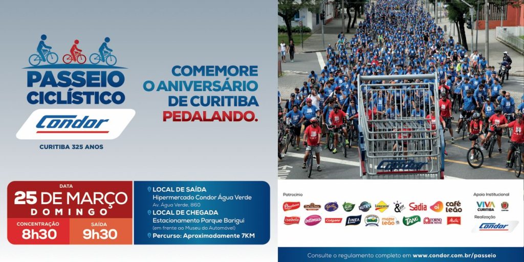 Neste domingo, dia 25 de março, acontece o tradicional Passeio Ciclístico Condor, em comemoração ao Aniversário dos 325 Anos de Curitiba. O evento conta com o apoio institucional da Prefeitura Municipal de Curitiba e da Secretaria do Esporte, Lazer e Juventude e terá um trajeto de aproximadamente 7km, que parte do Condor Água Verde (com […]