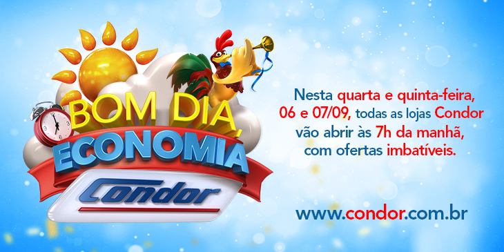 Nos dias 06 e 07 de setembro, as 43 lojas do Condor Super Center estarão abertas, excepcionalmente, a partir das 7h da manhã para a ação “Bom Dia, Economia”, que vai oferecer aos clientes promoções imperdíveis em todos os departamentos. Além das ofertas em diversos produtos, a rede ainda oferece um parcelamento diferenciado no cartão […]