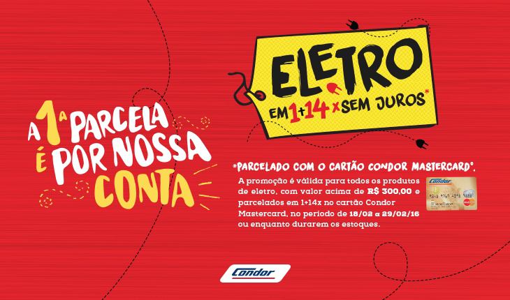 A promoção “primeira parcela paga pelo Condor” continua. Até o dia 29 de fevereiro, os clientes Condor que comprarem qualquer produto de eletro acima de R$ 300,00 em 1 + 14x sem juros, parcelados com o Cartão Condor MasterCard®, terão a primeira parcela paga pela Rede. O endereço de todas as lojas pode ser encontrado […]