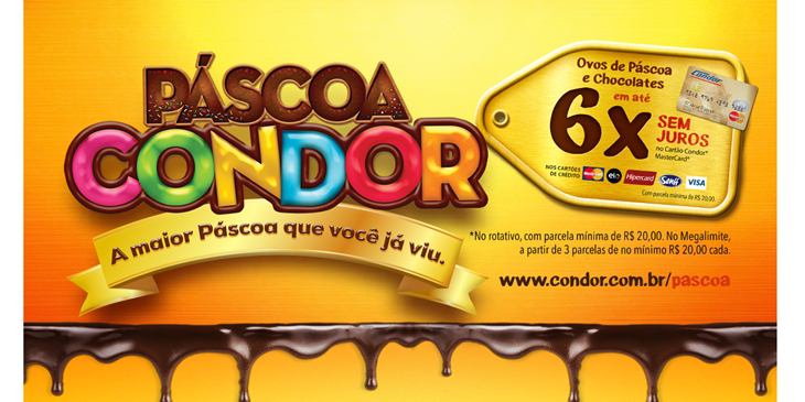 Com o Slogan “Páscoa Condor. A maior Páscoa que você já viu”, o Condor Super Center promove a campanha mais gostosa do ano. Para satisfazer a todos os gostos e atender a todas as classes sociais, será disponibilizado um mix completo, com preços competitivos e um parcelamento em até 6x sem juros no Cartão Condor MasterCard e nos principais cartões de crédito.